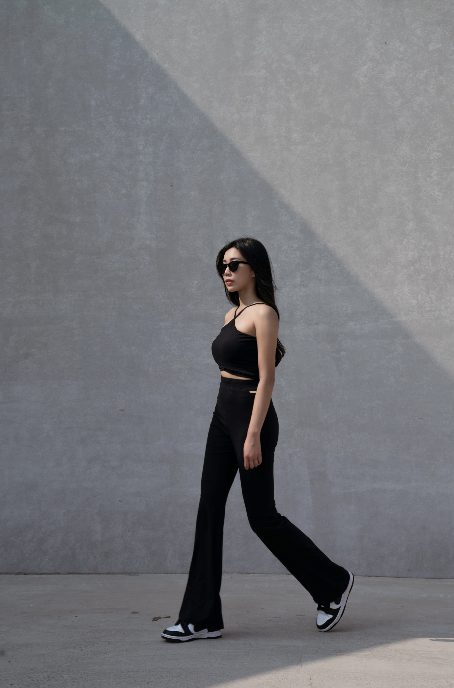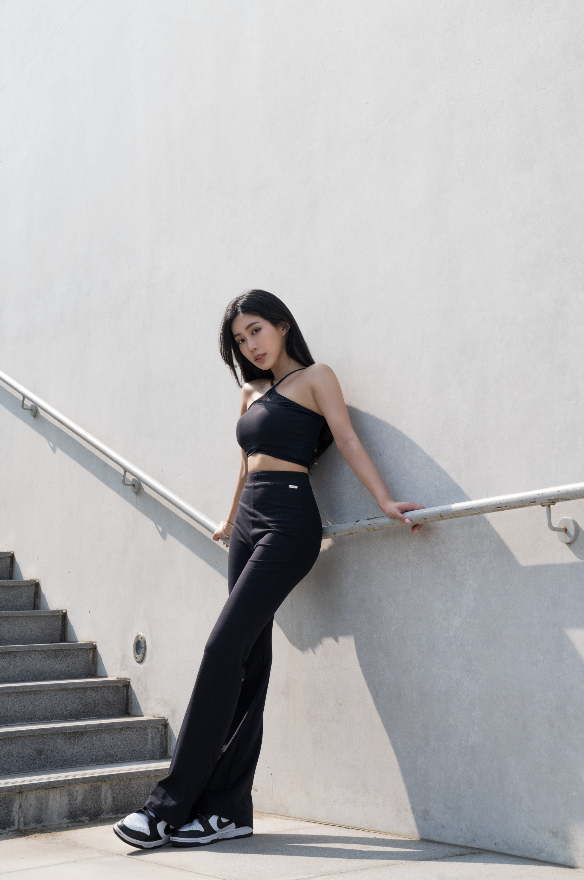 下身是落地的褲長~